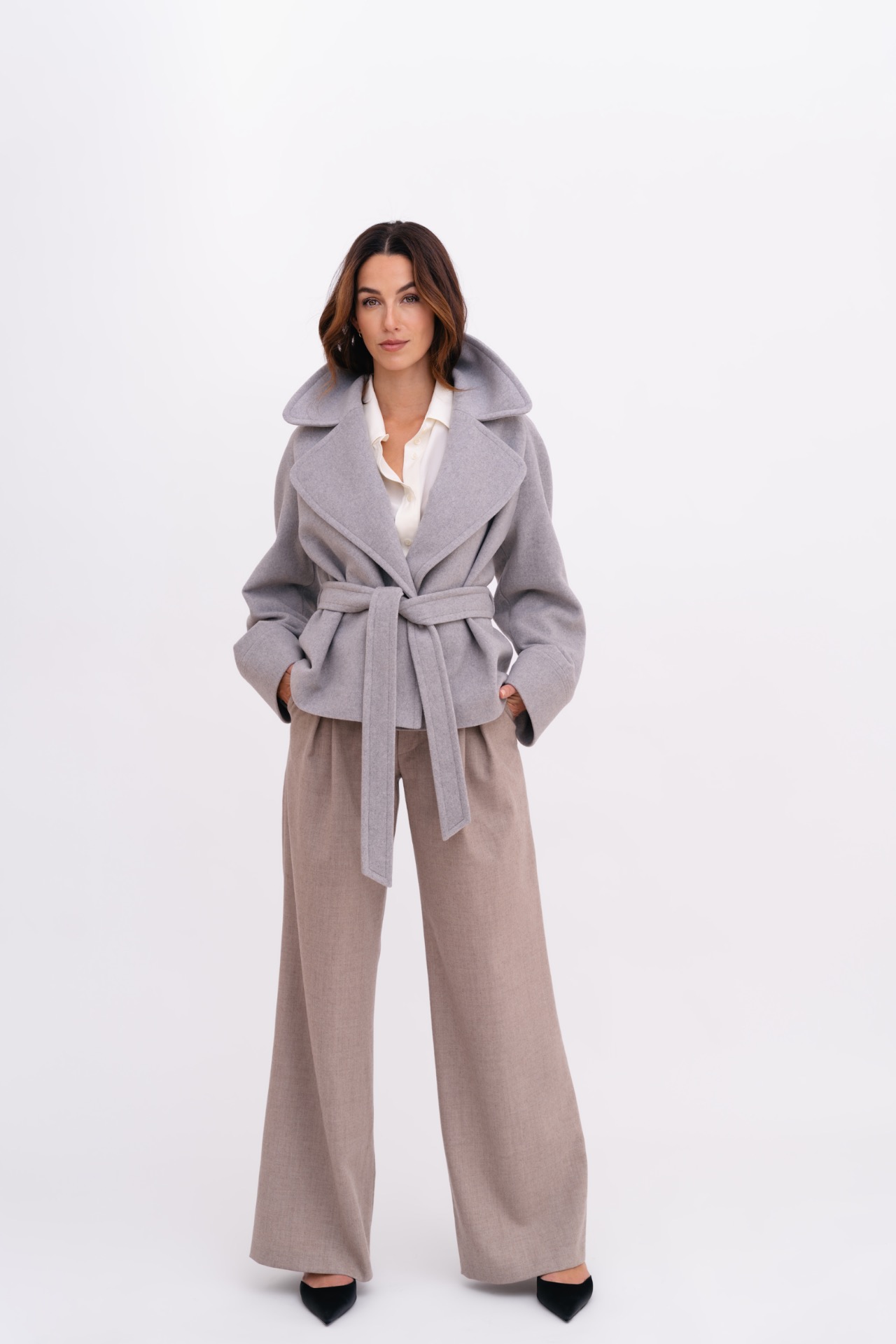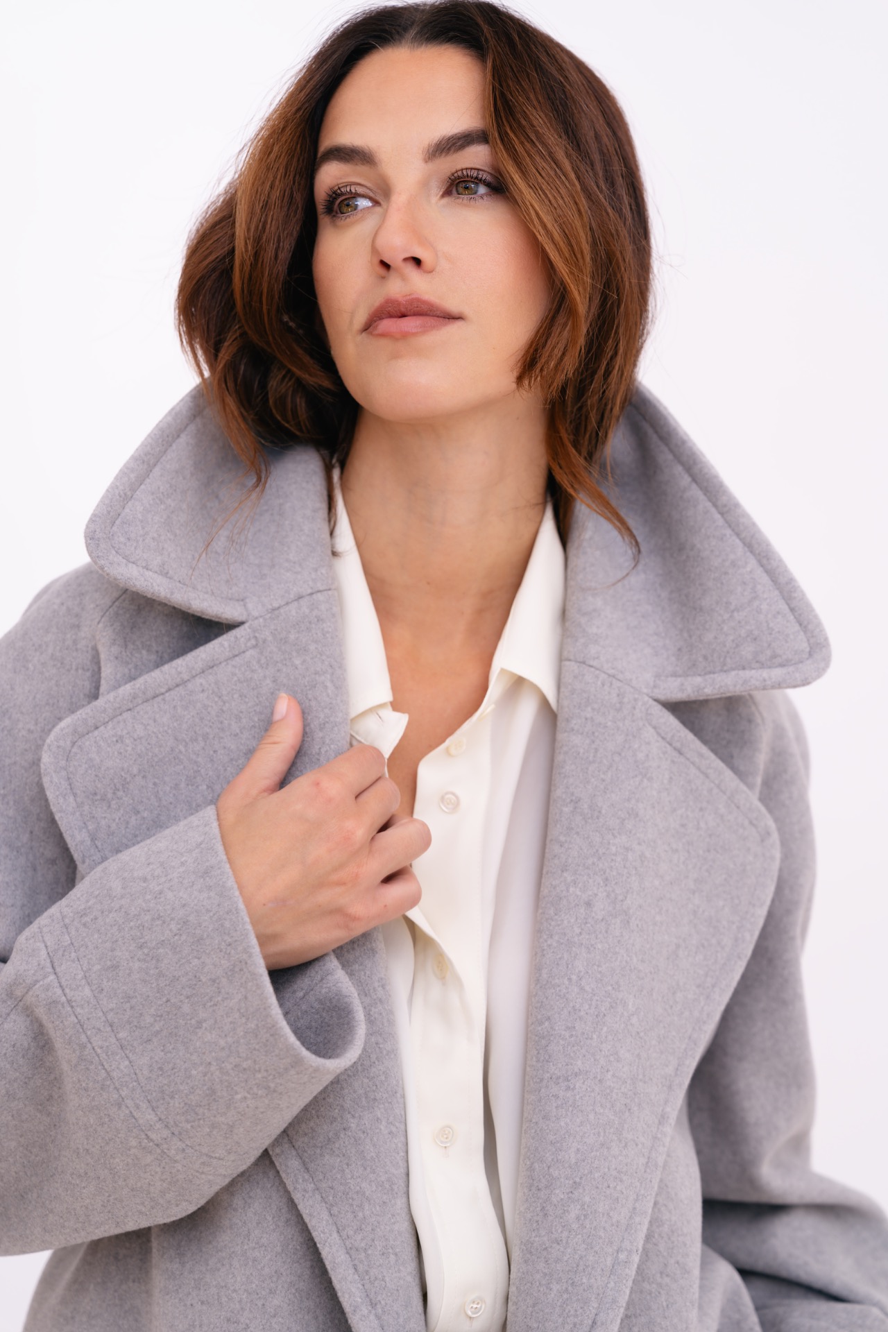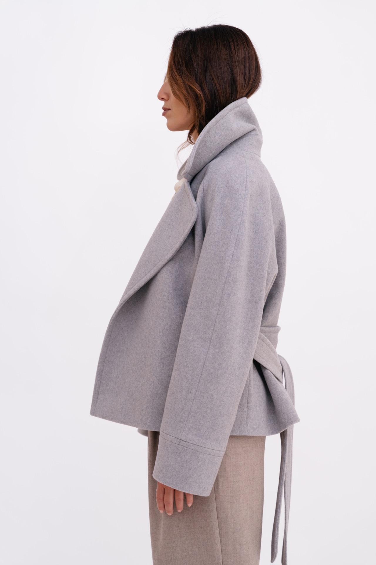 Krátký kabát z vlny s vysokou gramáží, která poskytuje příjemné teplo a vysoký komfort v zimním období. Raglánové rukávy zajišťují pohodlné nošení a přirozený pohyb, zatímco kratší délka umožňuje snadné vrstvení a variabilní kombinování s kalhotami i sukněmi. Precizní střih a minimalistické zpracování dodávají modelu sofistikovaný a nadčasový charakter.