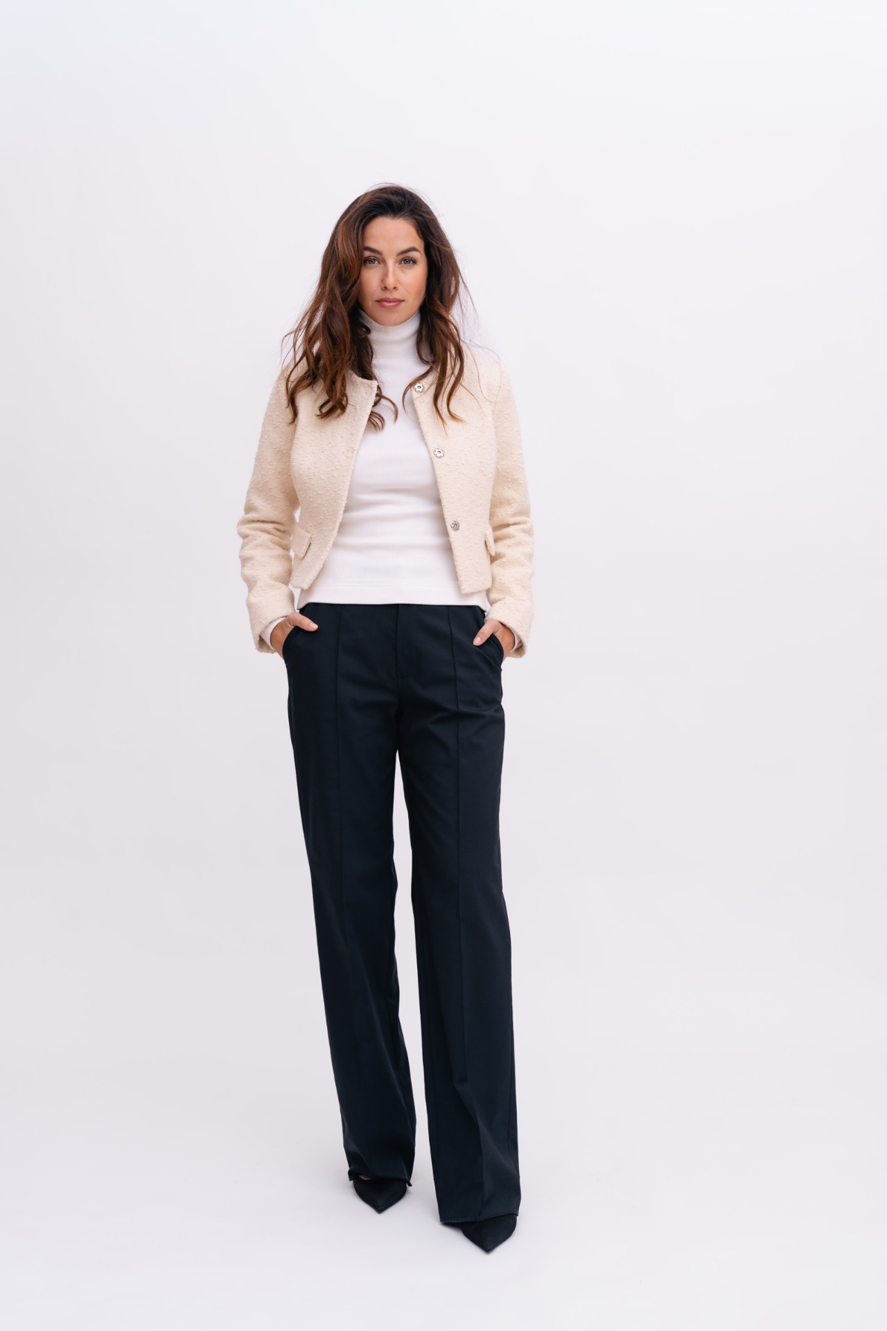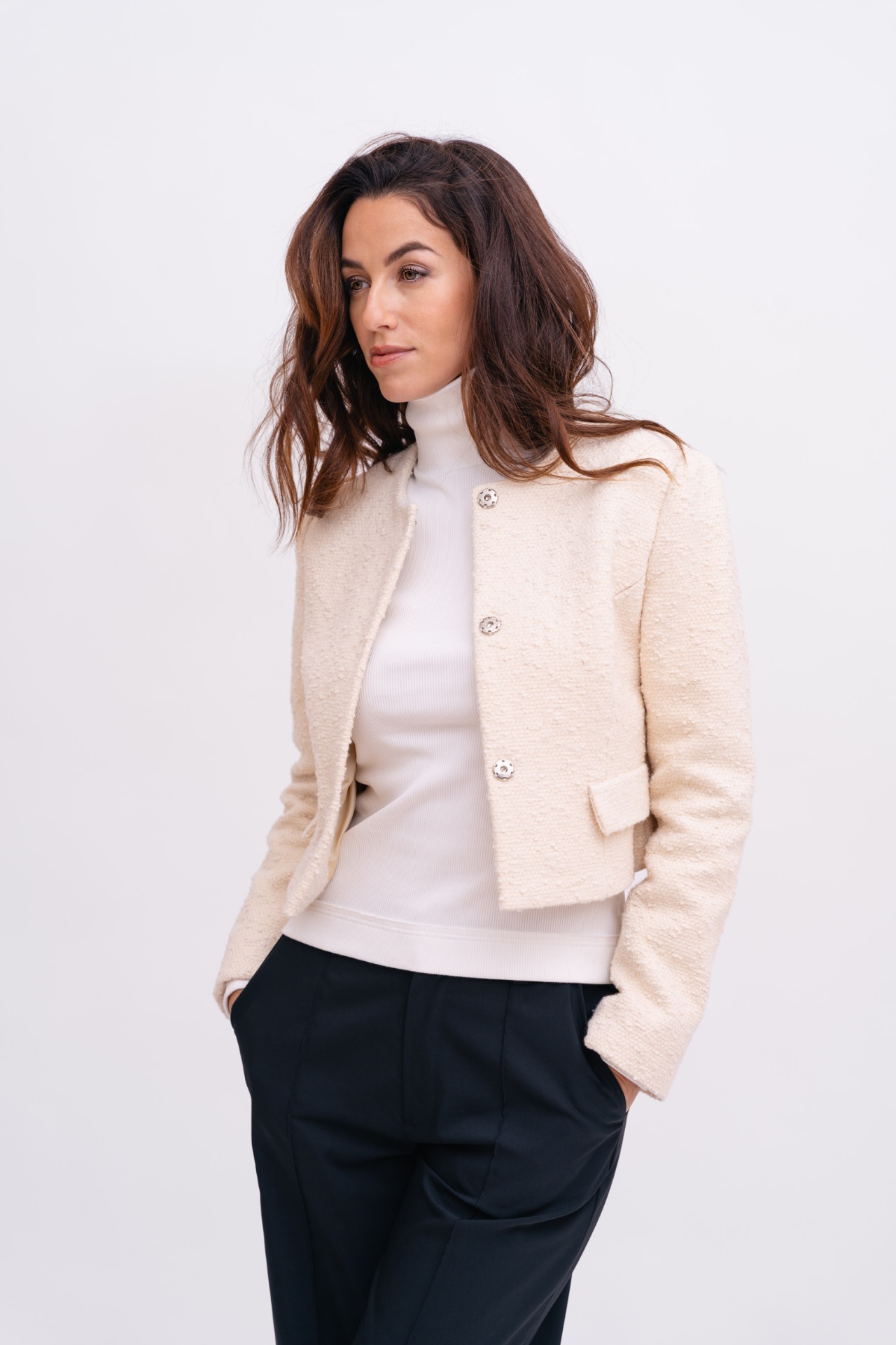 Krátké sako z bouclé v jemném smetanovém odstínu. Materiál s podílem bavlny a vlny má výraznou strukturu a je příjemný na nošení.