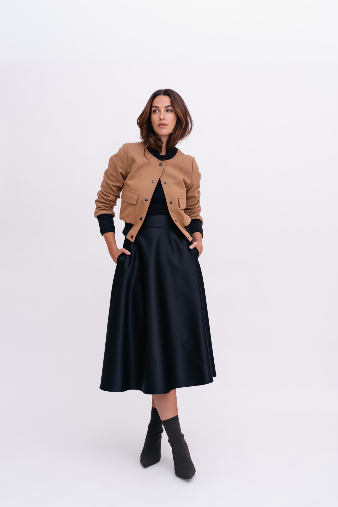 Vlněný bomber s moderním, lehce sportovním charakterem a čistými liniemi. Kratší délka umožňuje snadné kombinování se sukněmi i kalhotami s vysokým pasem. Vlna dodává modelu příjemné teplo a sofistikovaný vzhled, díky čemuž je bomber vhodný pro každodenní nošení i elegantnější styling.