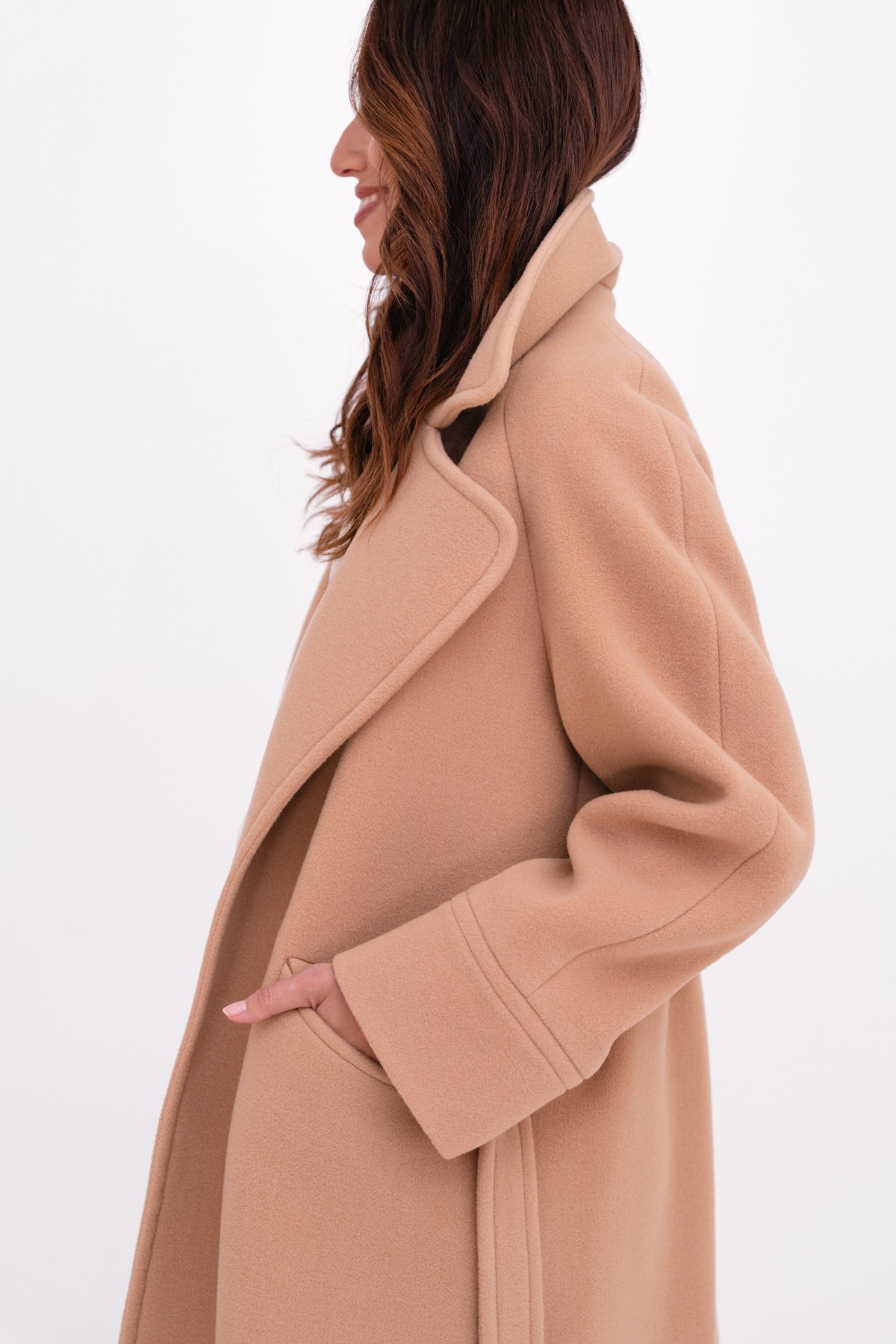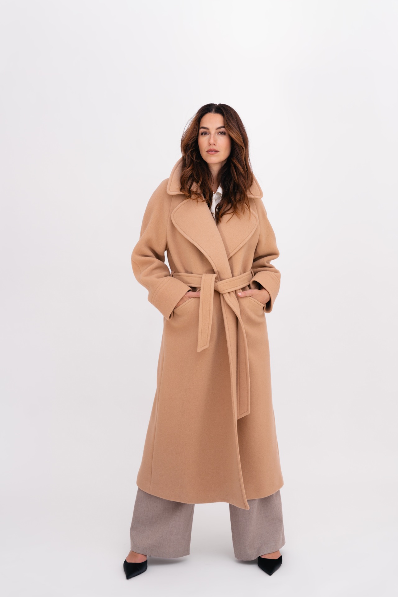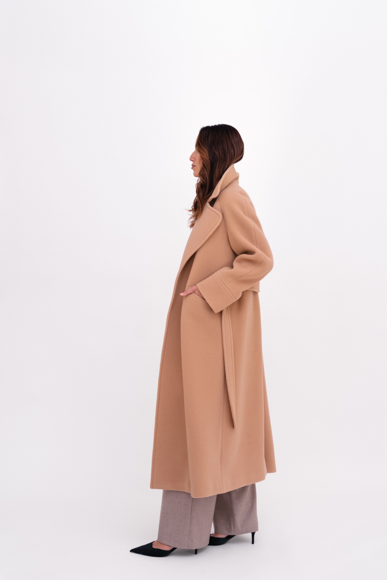 Dlouhý kabát z vlny s vysokou gramáží, který poskytuje výraznou hřejivost i v mrazivém počasí. Prodloužený střih vytváří čistý a nadčasový dojem, zatímco raglánový rukáv dodává modelu jemnost a uvolněnost. Minimalistické zpracování podtrhuje eleganci kabátu a umožňuje snadné zimní vrstvení i s objemnějšími svetry.