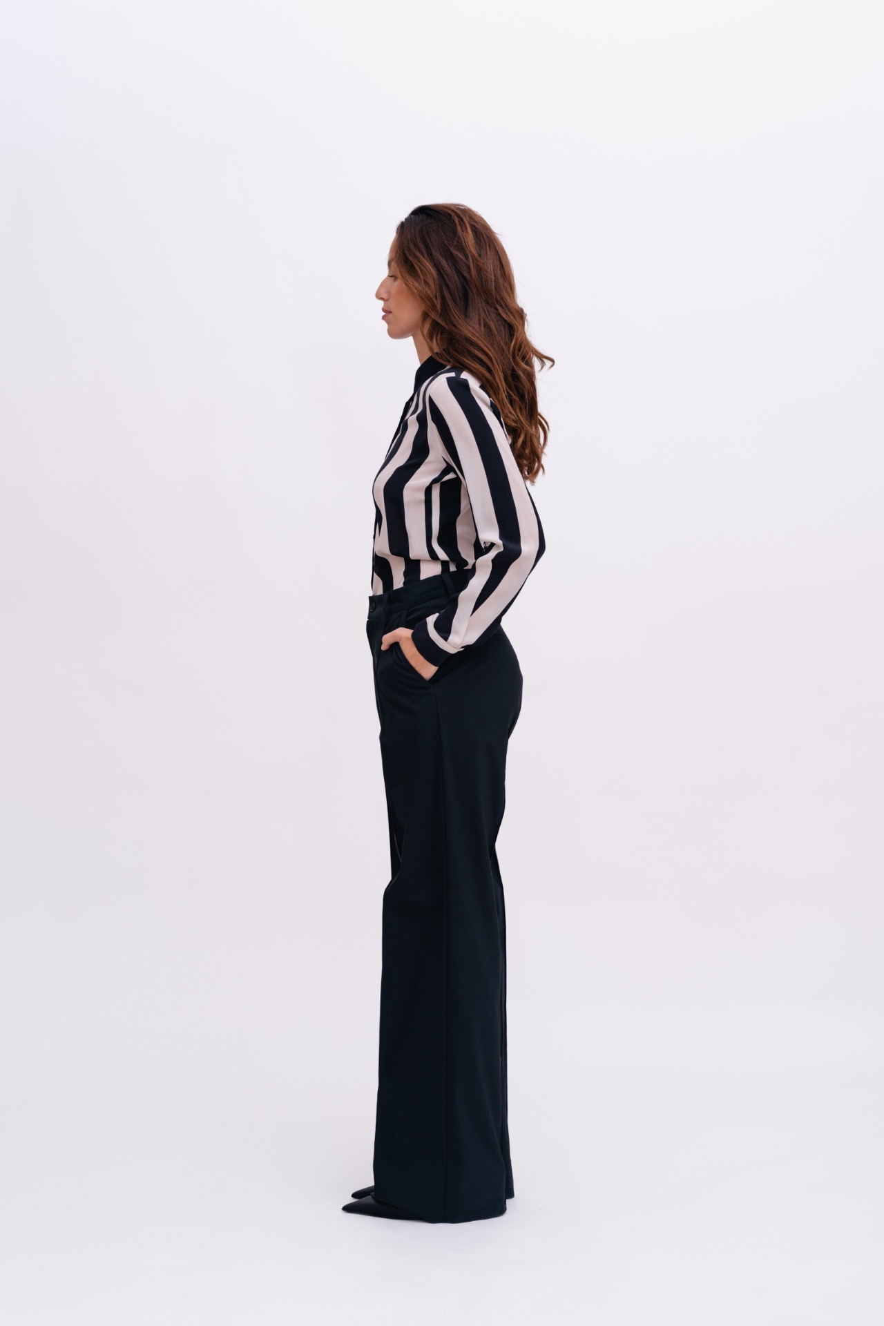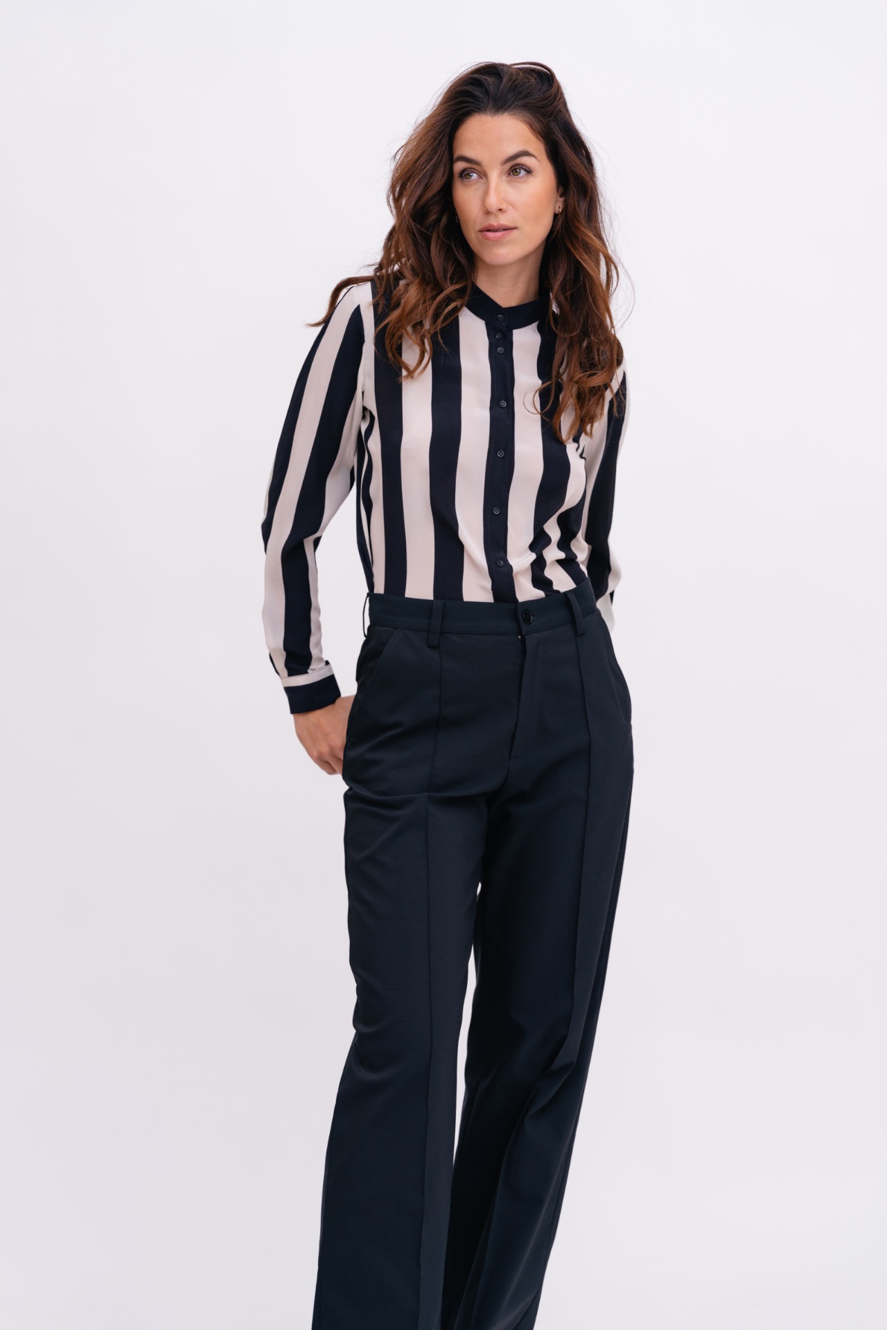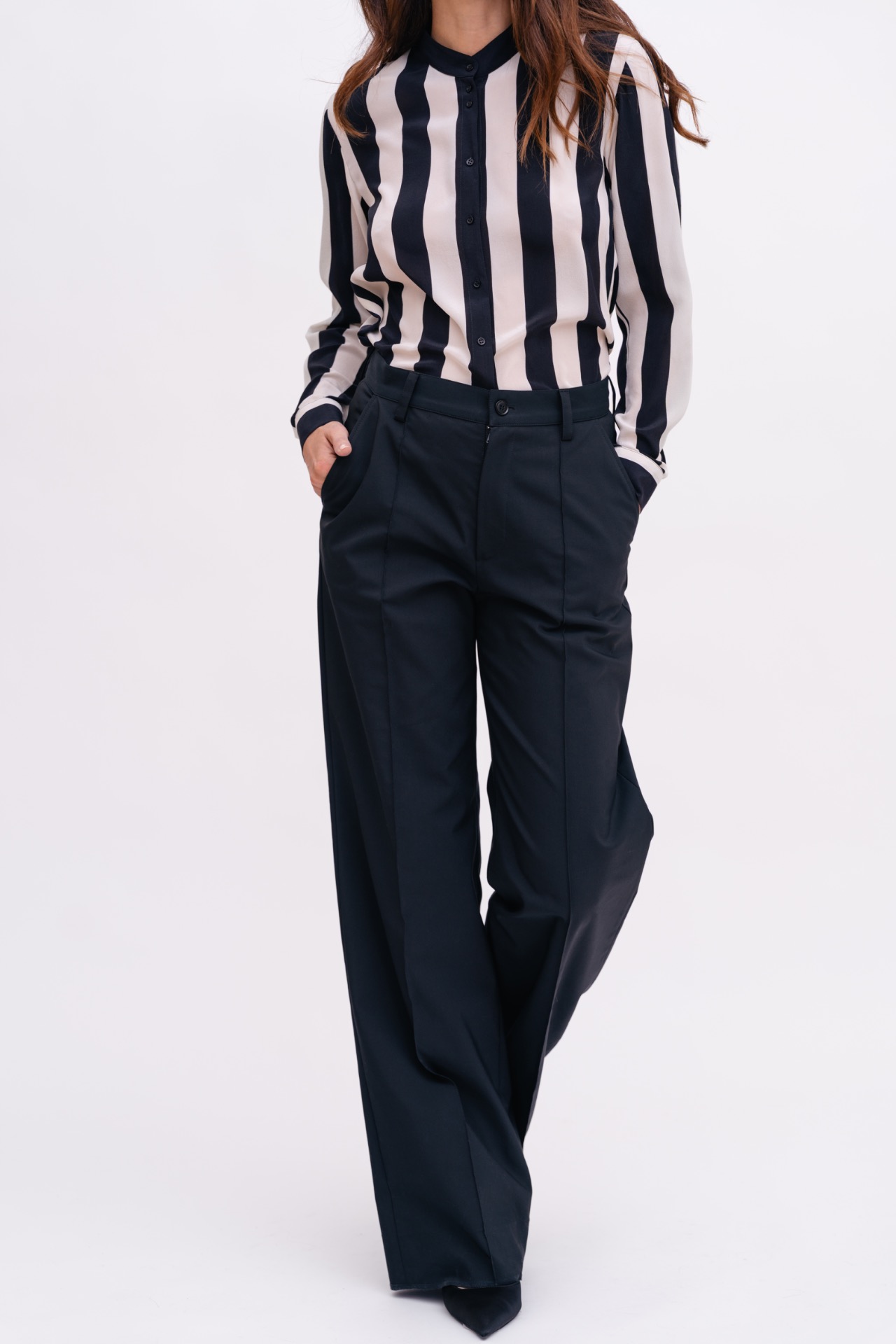 Střih je rovný, se středně vysokým pasem a puky v přední části. Kalhoty se snadno kombinují a fungují jako základ šatníku.