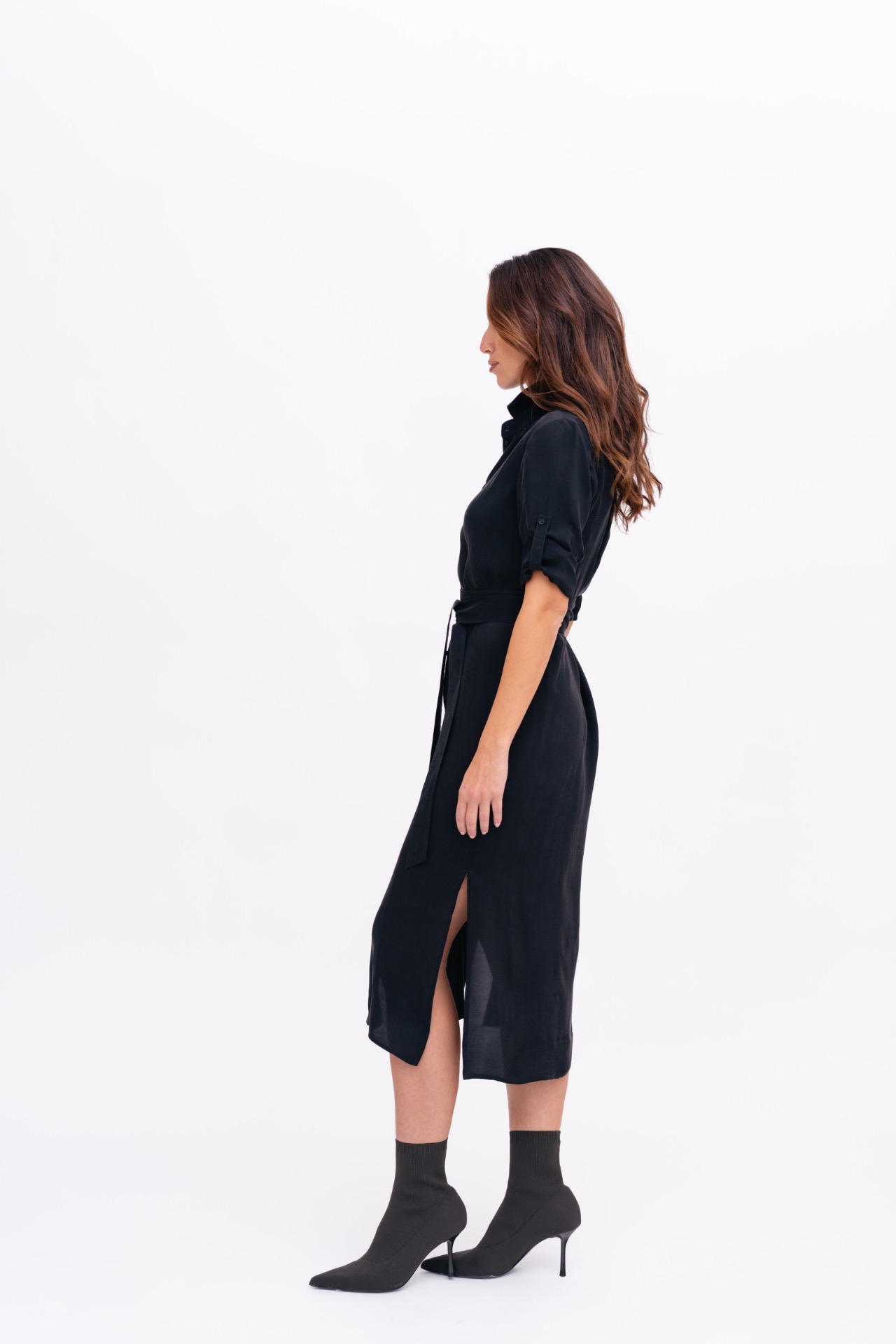 Elegantní košilové šaty z jemného cupra v nadčasové černé barvě. Materiál s hedvábným efektem krásně splývá, je příjemný na dotek a dodává modelu sofistikovaný a čistý vzhled. Dlouhý pásek ve stejné barvě umožňuje variabilní styling a zvýraznění siluety podle zvoleného stylingu.