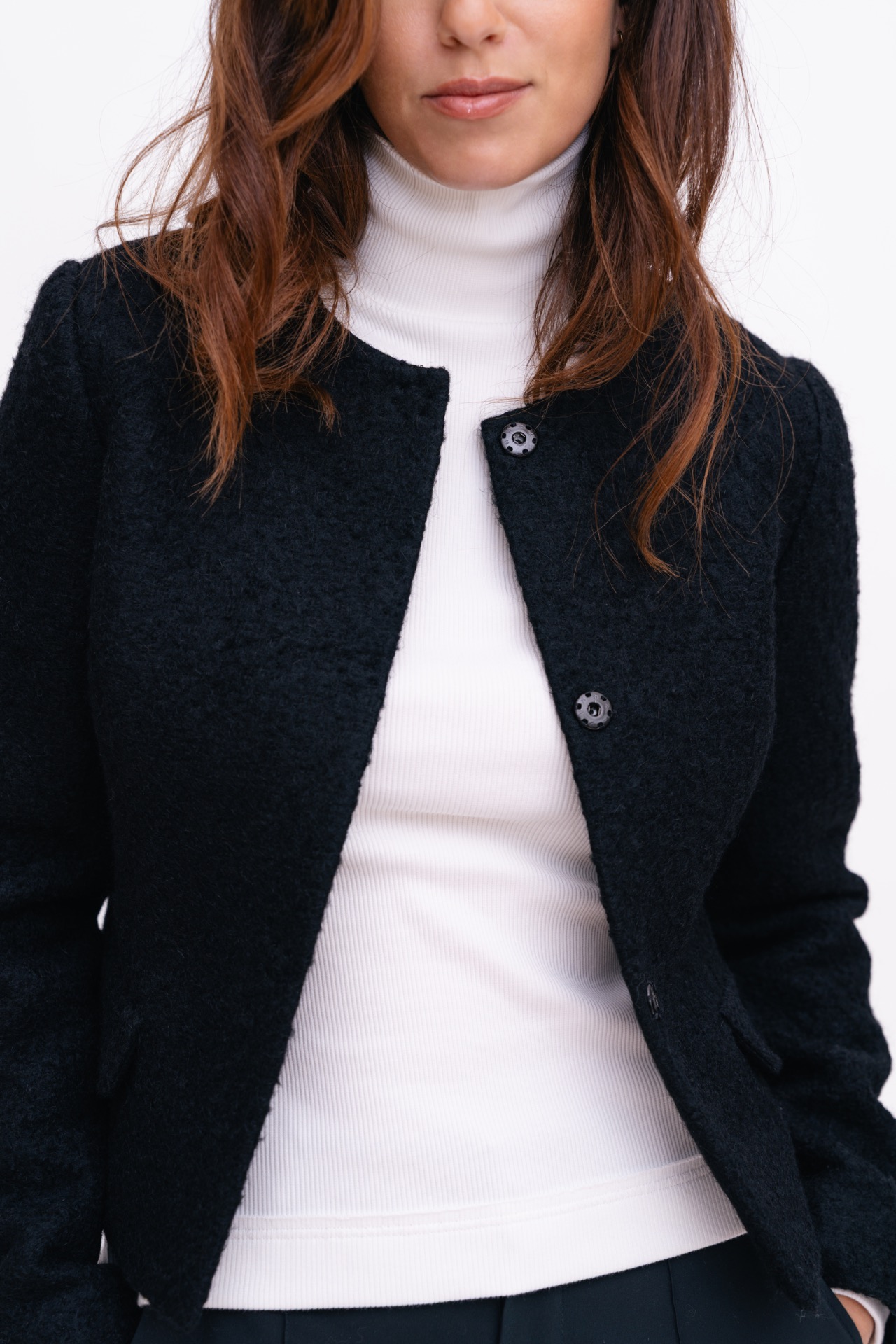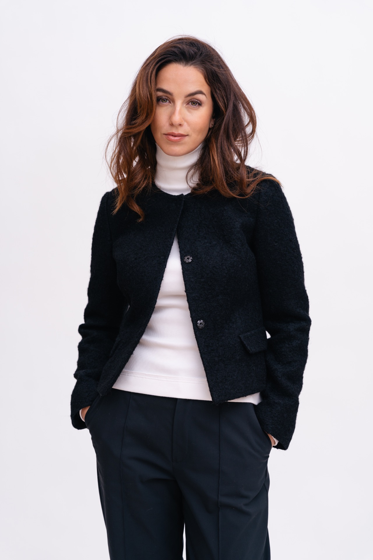 Elegantní černé sako ze 100% vlny s jemnou strukturou, inspirované klasickým chanelovým střihem. Sako má vnitřní zapínání na knoflíky, které zajišťuje pevné uchycení a čistý vzhled. Model nabízí široké možnosti stylingu. Díky kvalitnímu vlněnému materiálu je příjemný na nošení a vhodný pro celoroční využití.